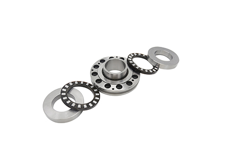 滾針/推力圓柱滾子軸承包括一個(gè)加厚的外圈、滾針保持器組件、滾針內(nèi)圈、兩個(gè)推力圓柱滾子保持器組件和兩個(gè)推理軸圈,相當(dāng)于一套滾針軸承和兩套推力圓柱滾子軸承的組合軸承,兩個(gè)推力圓柱滾子軸承中心和滾針軸承中心重合。